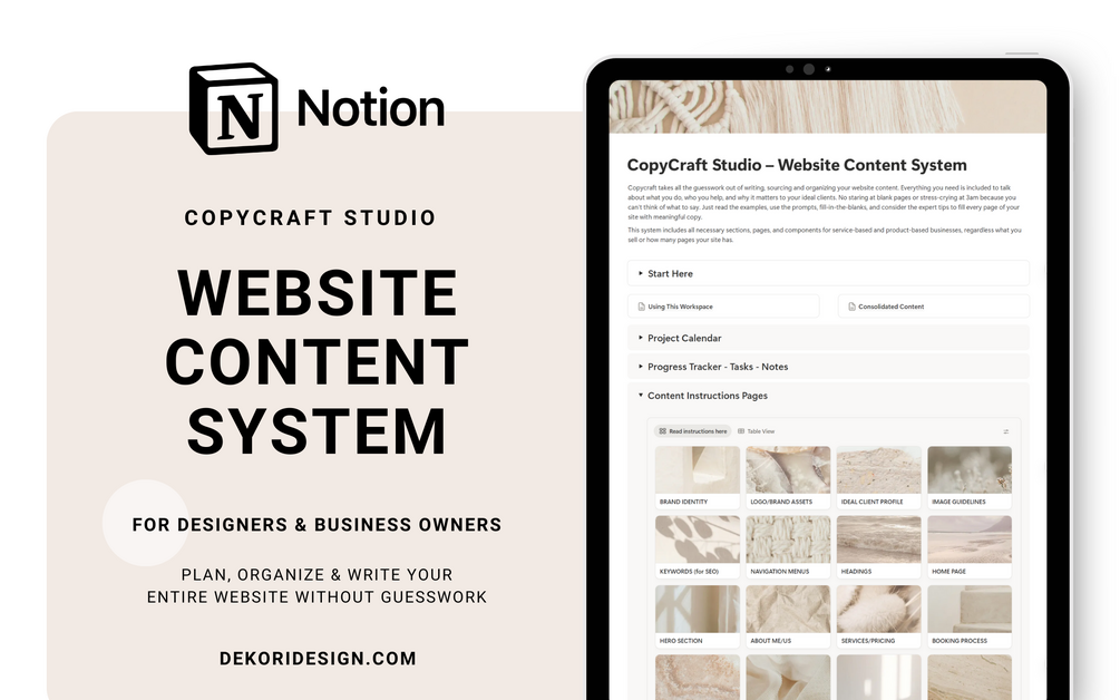 Welcome your new favorite business system – CopyCraft Studio! It's a complete Notion content system that actually gets your clients to deliver content in full, on time, organized, and ready to use.